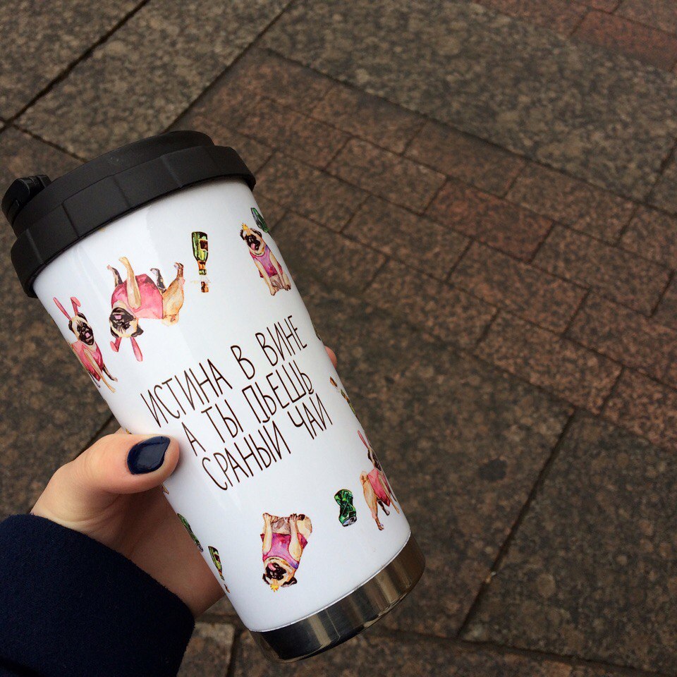 На следующий день с утра я ездила к родственникам. Пока я гуляла, моя подруга съездила в "Галерею" и купила мне подарок, о котором я давно думала (в этом году у меня лучшие подарки на день рождения). Это оказалась термокружка от "МамКупи", которую мы сразу же использовали для прогулки по городу (надпись на ней - "Истина в вине, а ты пьешь сраный чай"). К слову, кружка хорошая. Долго сохраняет температуру.